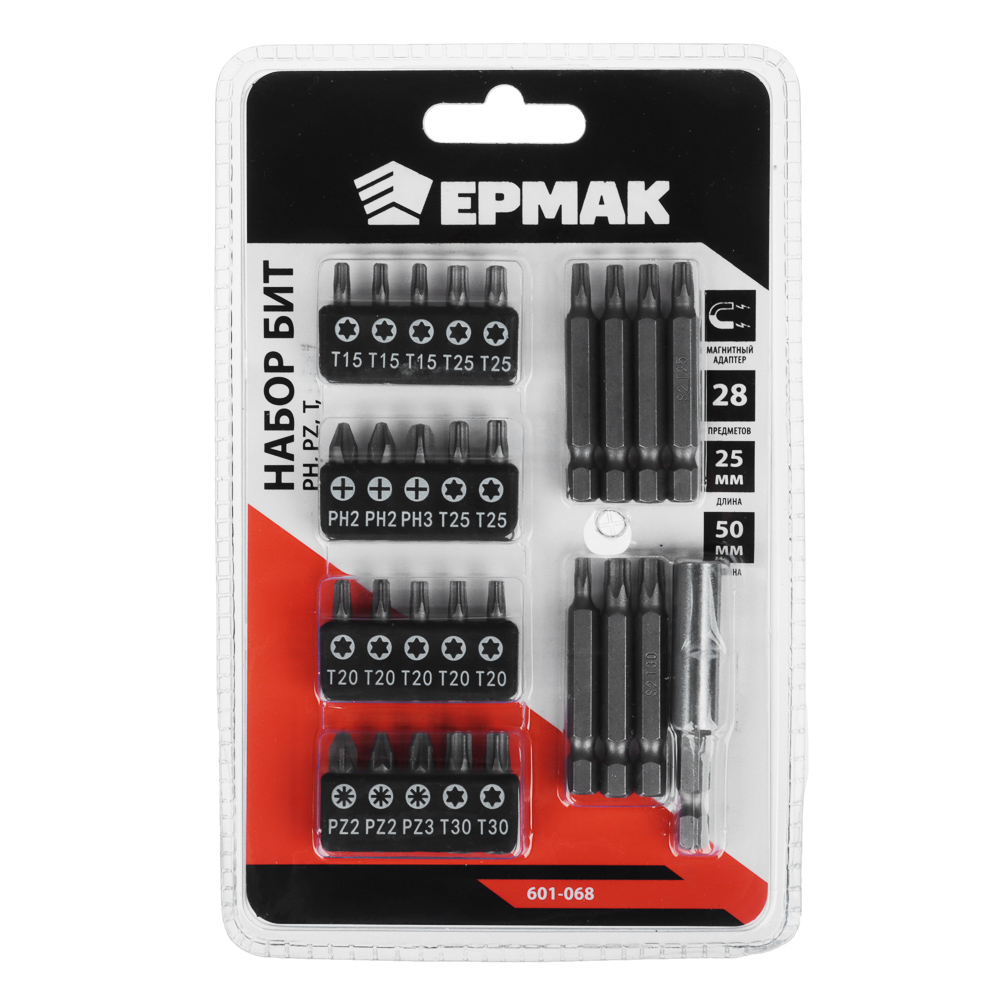 Набор бит на блистере 28 предметов 20 бит 25мм, 7 бит 50мм, адаптер Ермак 601-068