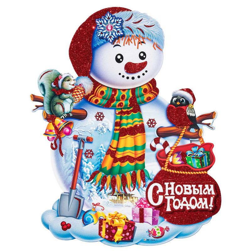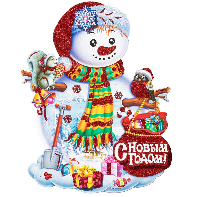 Плакат новог.карт. 2060-1 50см Снеговик с птичкой и белкой