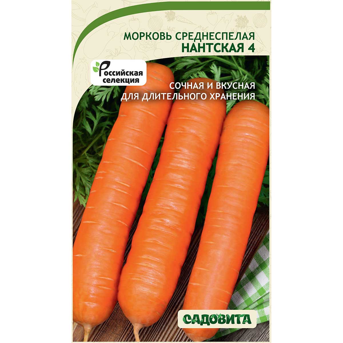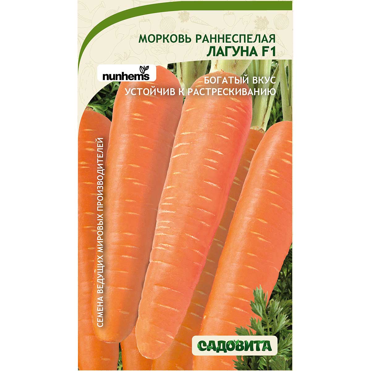 Среднеспелый гибрид с высоким содержанием каротина. Корнеплод цилиндрический с тупым кончиком, оранжевого цвета. Сердцевина маленькая, мякоть нежная, сочная, великолепного вкуса. Урожайность высокая. Рекомендуется для использования в свежем виде, переработки и длительного хранения.